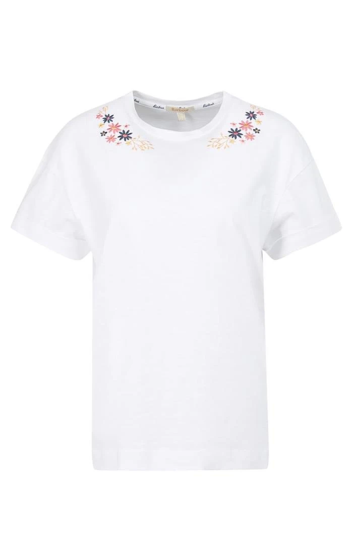 Update your style this season with this classic ladies Barbour Apia T-shirt featuring a fun floral appliqué embroidered onto each collar bone. Carefully crafted from beautiful 100% cotton for a rich, comfortable feel, this short sleeved top can be paired with your favourite jeans and shorts for the perfect feel-good look.