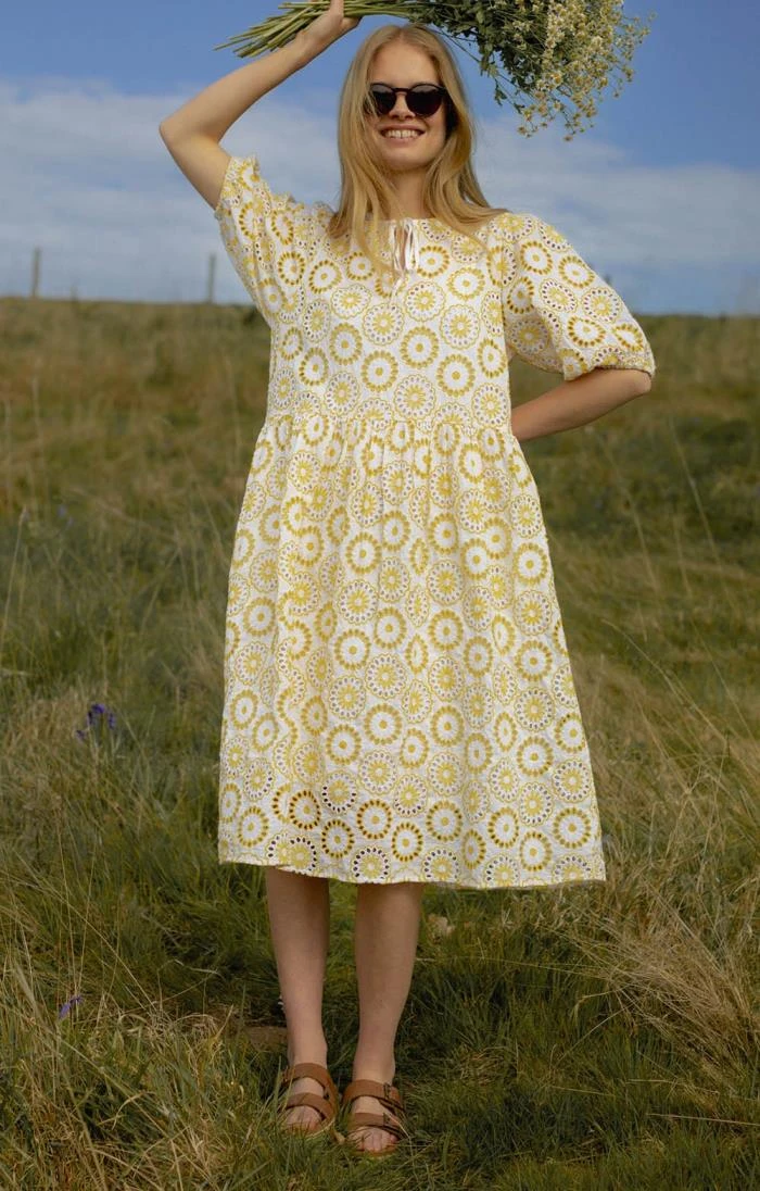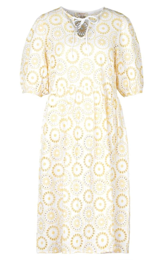 Steal the show on sunlit strolls and at summer parties in this beautiful cotton blend broderie anglaise Edis dress by Barbour. Falling to just below the knee from a gently gathered waistline in a flattering loose fit with cotton underslip, the notch neckline is finished with a tie detail and the elbow-length puffed sleeves are softly elasticated for a focus on comfort and feminine styling.