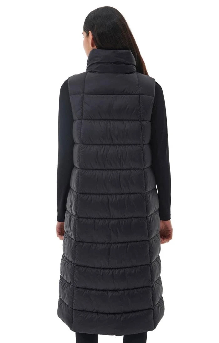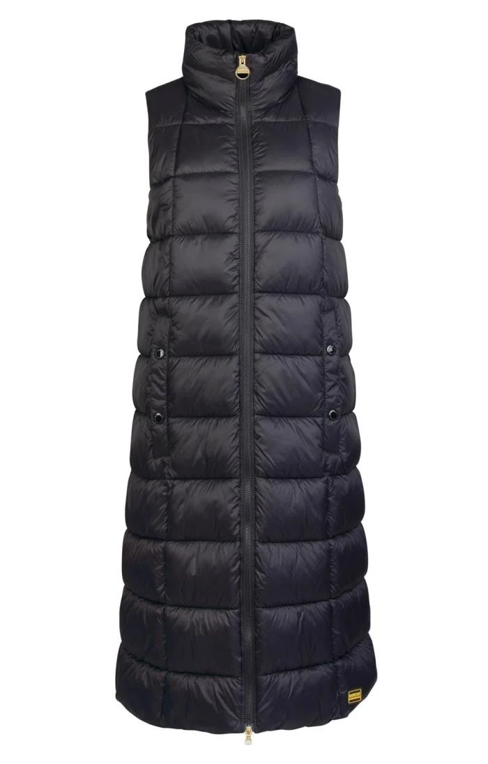 Navigate smoothly through mid-season months in the Thompson gilet by Barbour International with its modern longline silhouette crafted from stacks of square and rectangular filled insulated baffles. Finished with branded press stud pockets and a gleaming gold two-way zip, the funnel neckline caters for contemporary chic as well as cosiness and there’s a branded badge to the left hem for a mark of authenticity. Steer from sporty to sophisticated by switching up your accompanying ensemble.