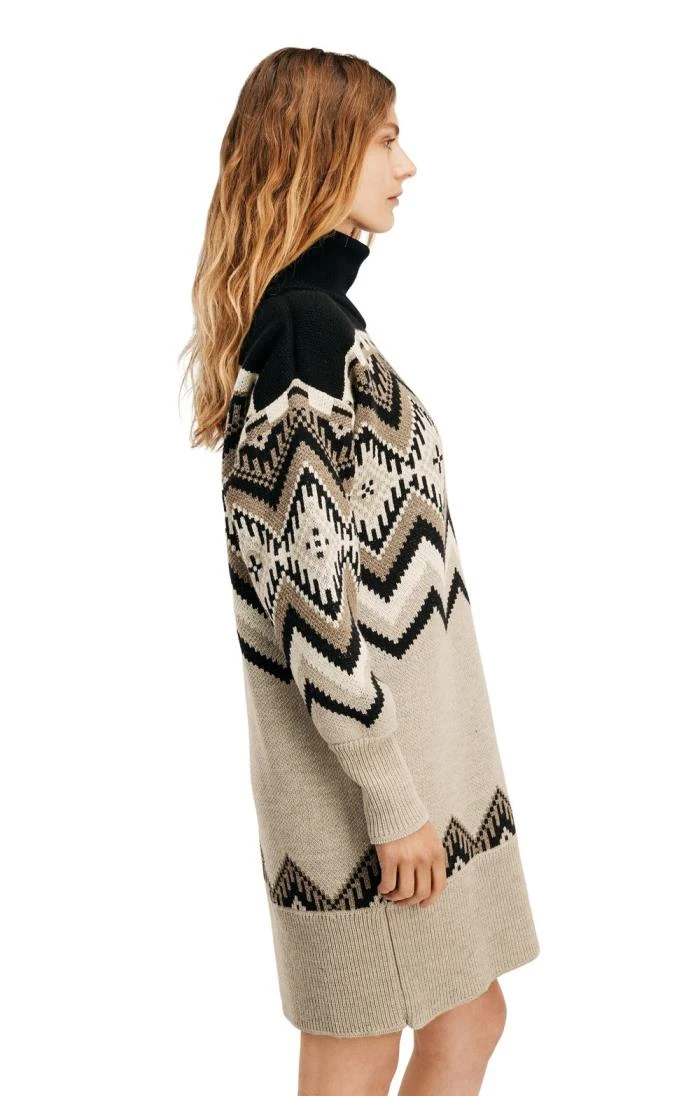 Beautifully knitted from premium quality merino wool , this eye-catching ladies Dale of Norway Skala dress personifies warm winter style. This pull-on design features a striking Nordic pattern with a sleek, figure-shaped silhouette and a hemline that finishes just above the knee, deep ribbing on the trim and dropped shoulders for a look of complete relaxation. Pair with thick tights and your favourite boots, plus a couple of chunky accessories for a contemporary style.