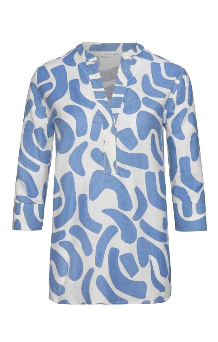 Make a bold and beautiful style statement in this cotton and linen blend two colour print overshirt by Eterna. Shaped with a stand collar and a flattering V-neckline with placket, its relaxed fit feels cloud-soft against this skin, while the loose three-quarter length sleeves throw the focus on elegant wrists with minimalistic jewellery. Let the exciting abstract patterns do the talking over white cotton jeans or neutral cropped linens.