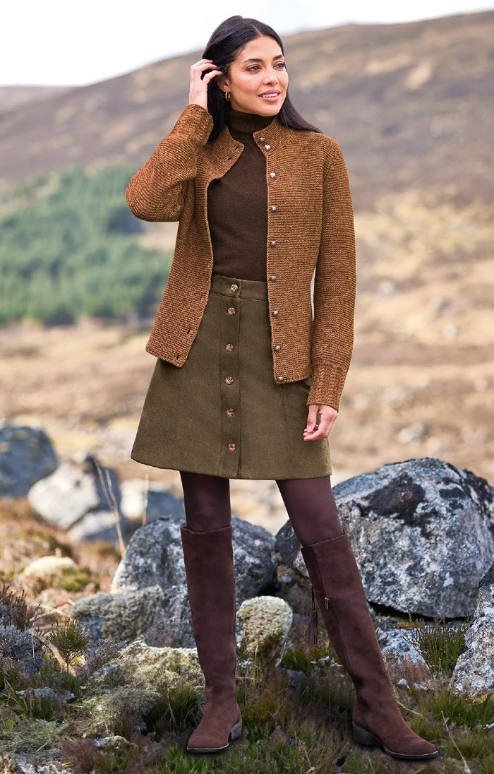 Crafted from a high quality British material that looks just like the real thing, this faux tweed skirt features a line of buttons down the front that highlight its unique texture and graceful drape. With its wonderfully rustic design and high-quality finish, it’s sure to attract many an admiring glance at all sorts of events and occasions.
