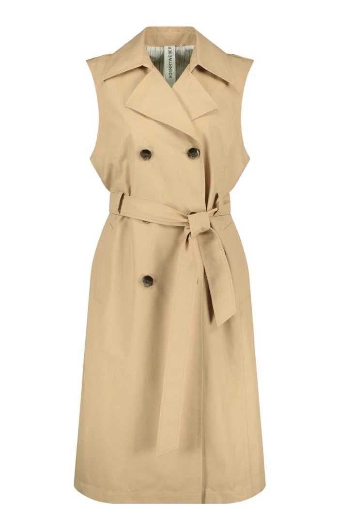 Classic styling with a contemporary twist, the long sleeveless waistcoat by Gerry Weber takes a familiar belted mac and turns up the trend factor by reimagining it in a sleek sleeveless silhouette. Showcasing a chic double breasted style with mock horn buttons, a large lapel collar and rear kick pleat, this fantastic fashion-forward piece is fully lined for enhanced comfort and an accentuation of quality.
