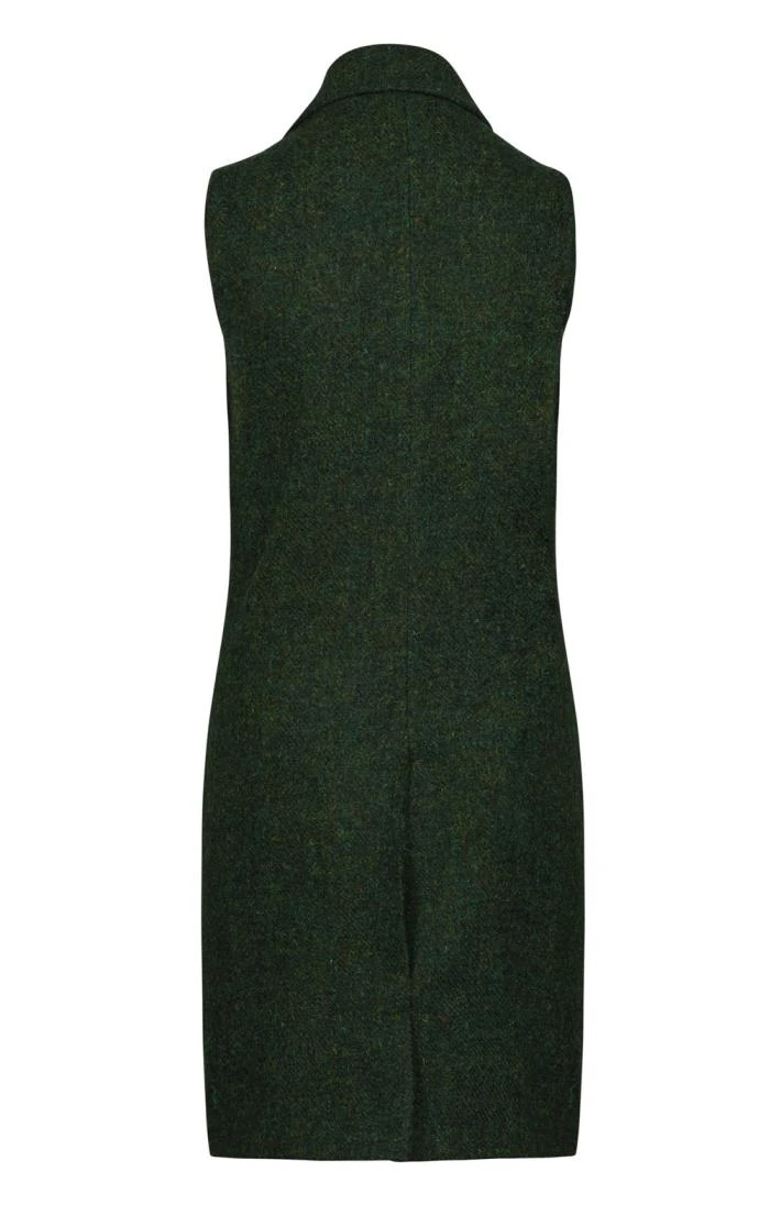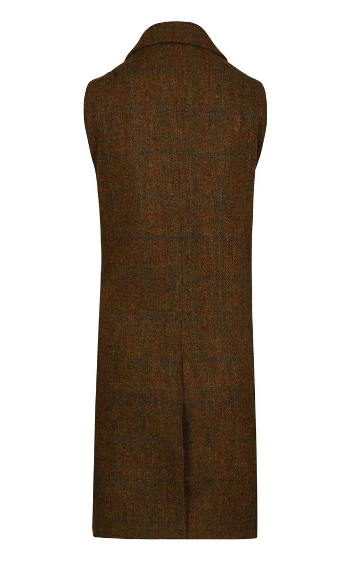 This 100% wool Harris Tweed Taylor gilet is cut in a longer length with a deep lapel collar and a hidden front fastening for a sleek and slimming silhouette. A country wardrobe essential with aspirations to infiltrate city and casual collections, smarten it up over a crisp white blouse with tailored trousers and heels or embrace its comfortable familiarity with a soft cord skirt and a tattersall check shirt.