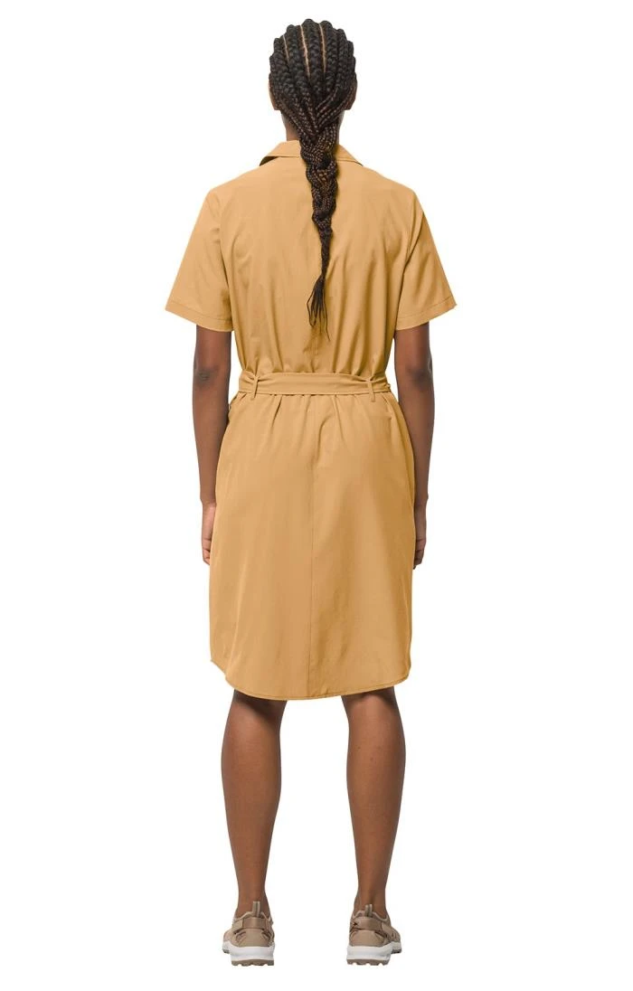 Get ready for sunshine at home or abroad with this Jack Wolfskin Holiday midi dress in a classic button-down style. Crafted from a blend of recycled materials, this unique summer dress affords factor 40+ protection from UV rays, making it an excellent choice for beach-going travels. The wick away fabric is slightly stretchy for added comfort, and as well as a self-coloured tie belt at the waist this pretty knee-length shirt-style dress boasts a buttoned collar and side pockets in the seams.