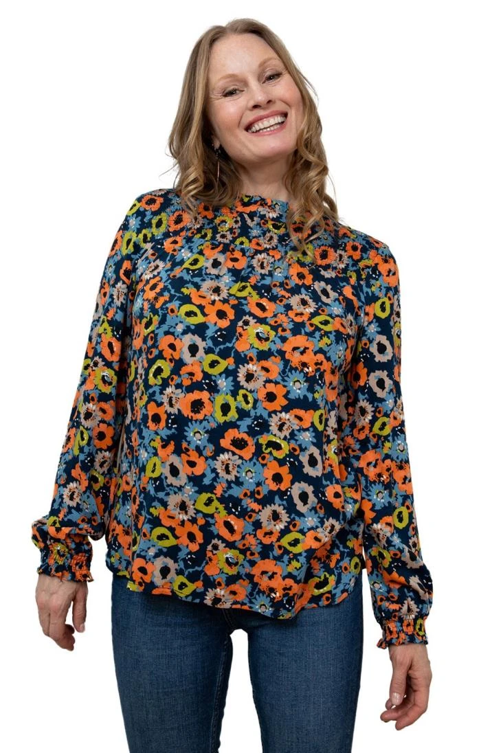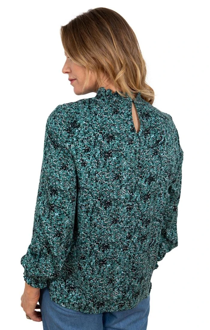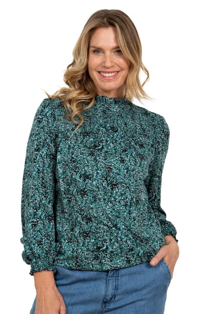 Bold and beautiful, this ladies Lily & Me gathered top shows off a striking print and fun matching ruffled cuffs and collar. Featuring a keyhole button neck at the rear and a curved hem for layering over jeans and skirts, this stand-out style brings colour and interest to this season’s wardrobe choice.
