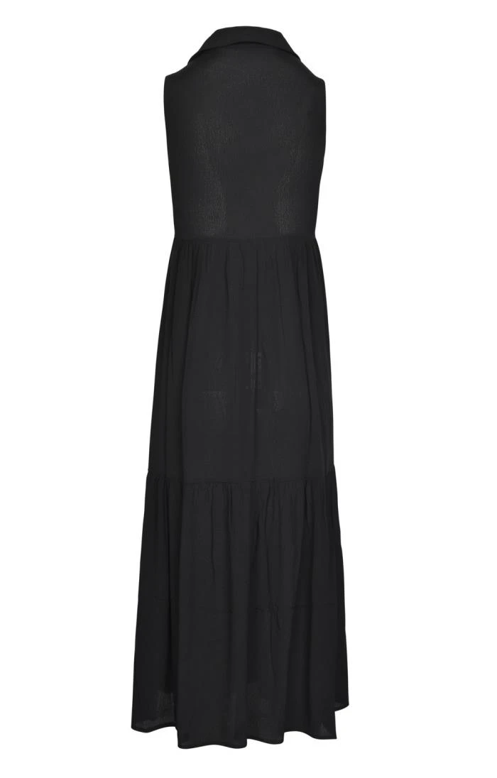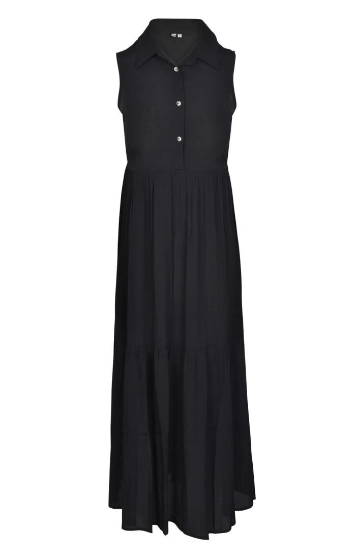 This ladies long button front dress with its Boho-inspired skirt is the perfect option for beach cover-ups and back garden barbeques. The sleeveless top is finished with a lay flat collar and a gathered waistline, while the dress is floor length for a maxi style. Pair with a wide brimmed hat and a bright scarf for a stylish statement outfit.