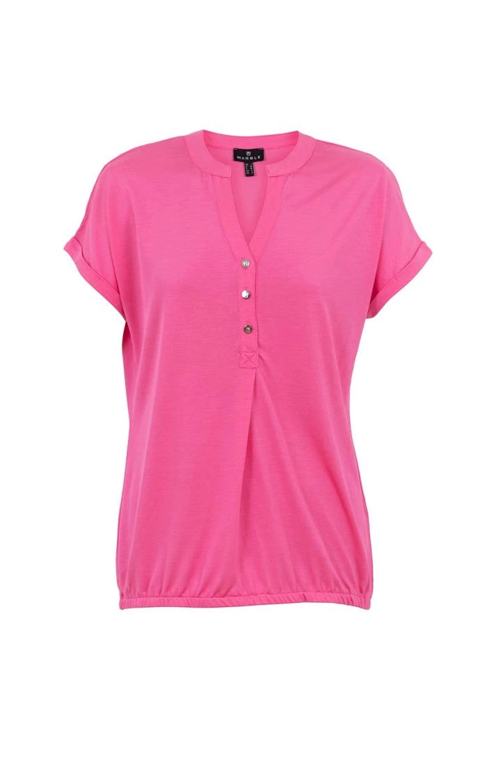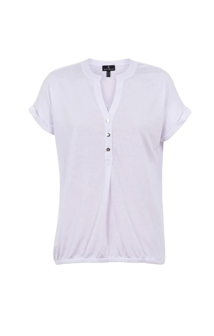 A relaxed look design with flattering capped sleeves, this ladies Marble button down V-neck top is both contemporary and stylish. It boasts a gathered hem that offers a flattering silhouette, capped sleeves and a deep neckline enhanced by button details. Easy to layer under a lightweight waterfall cardigan, pair with denim shorts for a laid-back summer look.
