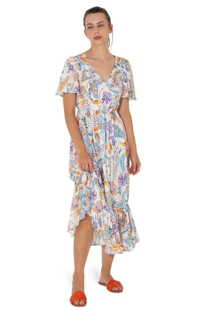 With its beautifully flowing outline in vibrant paisley patterns, the Ocaso dress creates a floaty feminine silhouette that flatters all shapes and styles. Falling to midi length from a V-shaped neckline with an elasticated waist, flouncing gathered skirts and a ruffled hem, the pretty flutter sleeves cover the tops of the arms for protection and disguise. An expression of enduring elegance and individuality, this fabulous frock will steer you successfully through many seasons of summer parties and special occasions.