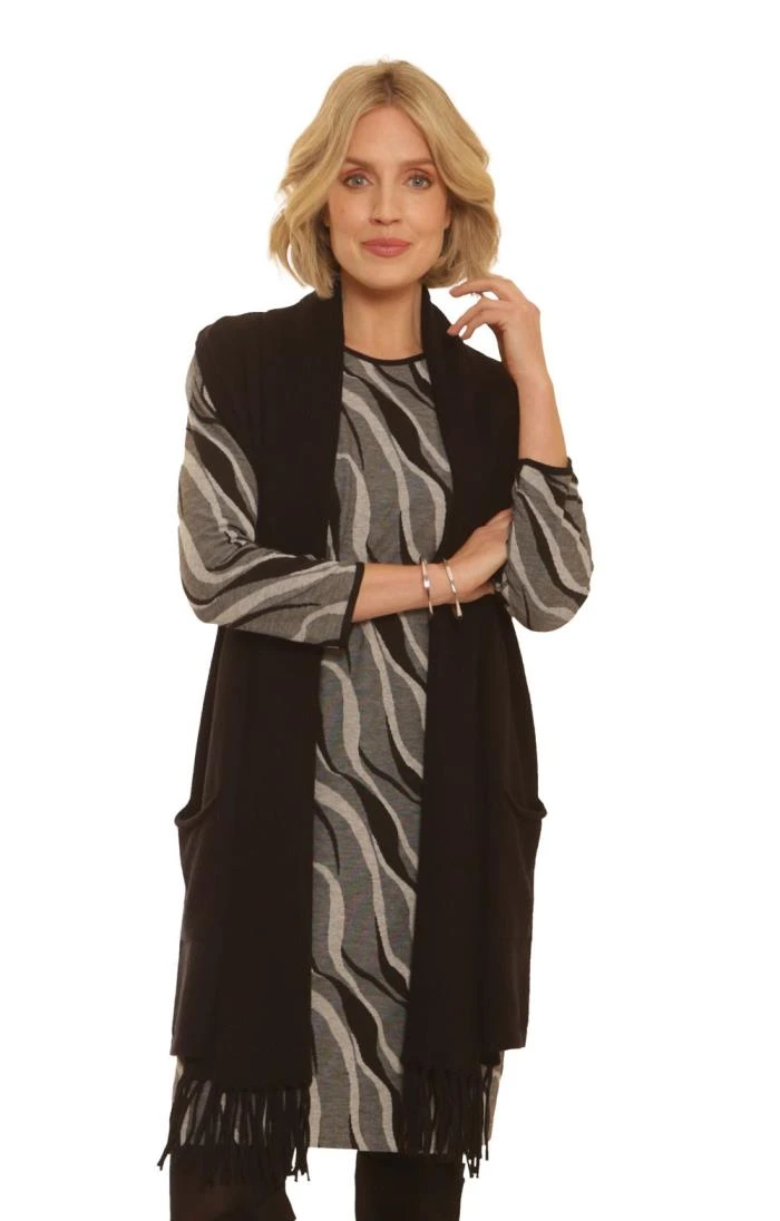 A beautiful addition to your winter wardrobe, this ladies Pomodoro long waistcoat is both practical and attractive. The thigh-length hem is finished with fun tassel details, while the waterfall collar adds to its draped effect. With two deep patch pockets in matching material and a sleeveless cut, this is an attractive way to layer up your favourite outfits in style.