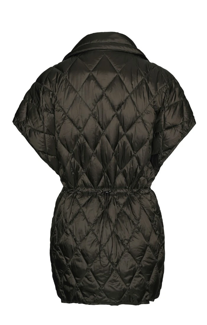 With its wide cap-shaped shoulders and drawstring waist, this diamond quilted cape waistcoat is an expressive and innovative update of a much-loved country classic. Featuring vertical side pockets with stud closures, a zipped front fastening and side studs for added convenience.