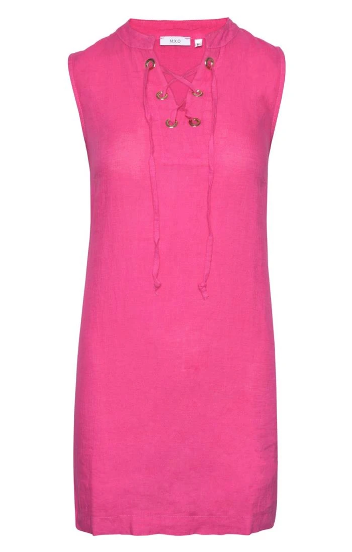 This short and summery ladies tie neck linen dress will be a welcome addition to your holiday wardrobe. Featuring a cropped length and sleeveless silhouette, it boasts a lace-up front closure that offers a variety of styling choices depending on your mood. Perfect for relaxing by the pool or taking in the sights, it also works as a great beach cover-up when the sun gets a touch too hot.